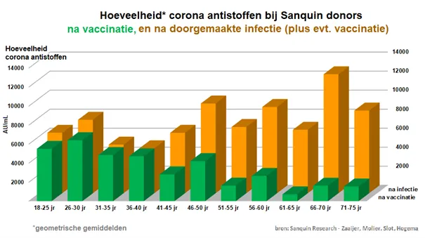 Verdiepend onderzoek van Sanquin toont afname van corona-antistoffen bij hogere leeftijd en naarmate de vaccinatie langer geleden is. Dat kan worden veroorzaakt door natuurlijk verloop van antistoffen, en/of door een verminderde reactie van afweer bij mensen van hogere leeftijd. Gemiddeld worden meer antistoffen gevonden bij diegenen die zowel gevaccineerd als geïnfecteerd zijn. Sanquin hoopt de afname van aanwezige antistoffen in Nederland met regelmatig vervolgonderzoek te gaan meten.