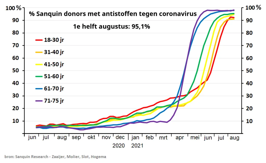 De vaccinatiestrategie is duidelijk terug te zien in de stijging van de antistoffen bij steeds jongere donors. Van half april tot half juli steeg het aantal donors met antistoffen elke week spectaculair, met gemiddeld 5% per week. Vanaf half juni stegen ook het aantal donors onder de 30 jaar snel. Eind augustus heeft ruim 95% van de donors van Sanquin antistoffen en is duidelijk te zien dat een plateau wordt bereikt.