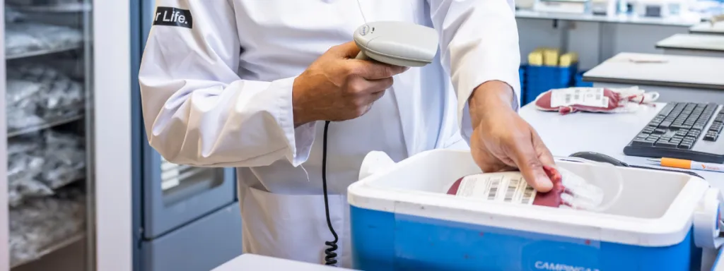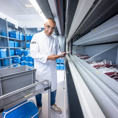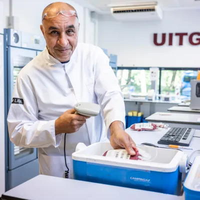 “Via ons digitale bestelsysteem komen de aanvragen van ziekenhuizen binnen”, vertelt Rachid Essinouh, teamleider Uitgifte. “Dan krijgen we bijvoorbeeld de vraag om een zak bloed met de bloedgroepen A-, Kell-, Duffy- en ‘parvoveilig’ – dat wil zeggen dat er antistoffen tegen het parvovirus B19* in het bloed moeten zitten. Wij zoeken dan een zak in onze voorraadkast dat aan deze voorwaarden voldoet en scannen het label met het donatienummer en de productcode, zodat in het computersysteem staat dat het uitgegeven is. Het is ook een extra check op de goede zak.”