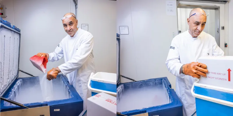 “Ook plasma geven we uit. Dat gaat in dozen van tien eenheden. Het plasma wordt bewaard ingevroren op -30 °C en wordt pas in het ziekenhuis ontdooid. Voor het vervoer in de koelbox schep ik wat droogijs erbij, om het goed koud te houden. Die handschoenen zijn zeker nodig, want van droogijs kun je brandwonden krijgen.”