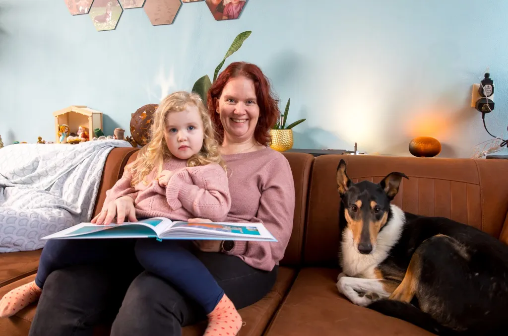 “Het is voor mijn ogen gebeurd”, herinnert Claire zich het ongeluk met haar dochter. “We waren in huiselijke kring bij elkaar, met een paar honden erbij. Mira was nog geen 2 jaar oud. Toen ze langs een van de honden liep, beet die haar uit het niets opeens in het gezicht. Direct sprong iedereen in actie. Ik greep de hond stevig vast om te voorkomen dat hij zijn kop heen en weer zou schudden; mijn man forceerde de kaken van de hond open en mijn moeder ontfermde zich over Mira, die heel hard huilde en schreeuwde. Dat geluid ging door merg en been, vreselijk. Haar gezicht bloedde ook hevig.”