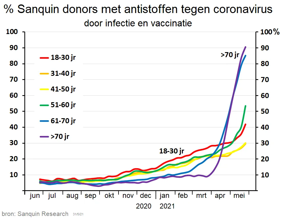Het verhoogde vaccinatietempo is terug te vinden in deze meting. Als het percentage mensen met antistoffen zo snel blijft stijgen, wordt misschien al in juli zoveel immuniteit bereikt, dat de circulatie van het coronavirus sterk onderdrukt wordt.