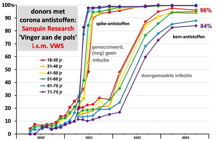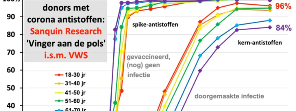 Sanquin Research meet regelmatig bij Nederlandse donors de antistoffen tegen SARS-CoV 2, en stelt vast of die zijn opgewekt door vaccinatie of door infectie met het virus. Bij de meest recente meting, eind september, is vastgesteld dat inmiddels 92,5% van de donors een infectie heeft doorgemaakt, wat de besmettelijkheid van de omikronvariant nog eens onderstreept. Het effect van vaccinatie meetellend, heeft minstens 99,7% antistoffen.