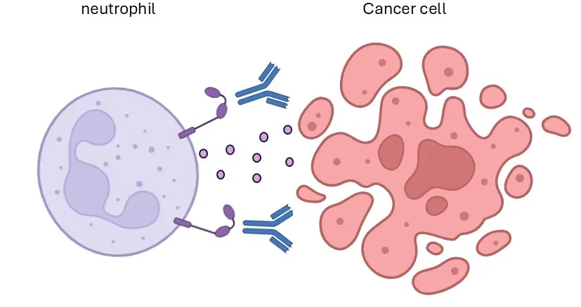 Image: neutrophil destroying a cancer cell via antibody recognition.