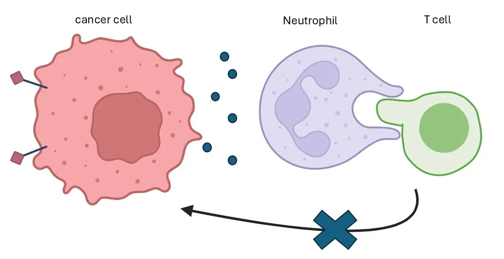 Image: the cancer cell secretes signaling molecules which prompt the neutrophil to inhibit the T cell, which can therefore no longer fight the cancer cell.