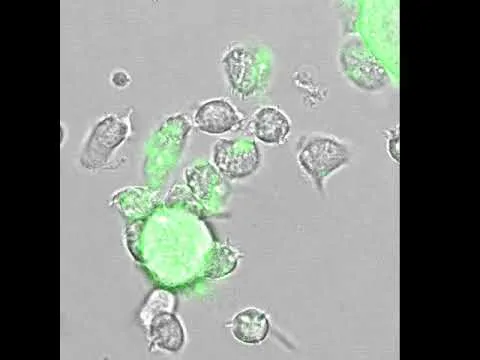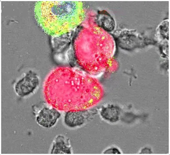 Photo: Neutrophils(colorless) tear pieces of the membrane of the antibody-bound cancer cells (pink). The upper cell has already burst, the contents are leaking out. In green a cancer cell that has been already killed.